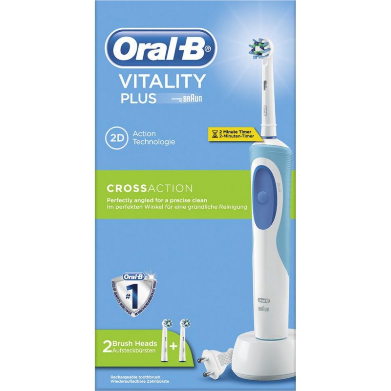 La brosse à dents électrique Oral-B Vitality Plus CrossAction nettoie et élimine les plaques dentaires plus efficacement qu’une brosse à dents manuelle classique grâce à son action de nettoyage 2D qui associe oscillations et rotations. Sa brossette CrossAction permet d’entourer chaque dent avec ses poils inclinés à un angle de 16 degrés. Produit neuf dans son emballage d'origine bénéficiant de la garantie originale du fabricant. EAN 4210201123637.
